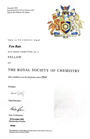 12月18日,英国皇家化学会(Royal Society of Chemistry,RSC)发来贺信,兰州理工大学冉奋教授在化学、材料和交叉领域做出卓越贡献,当选为英国皇家化学会会士(Fellow of the Royal Society of Chemistry, FRSC)。